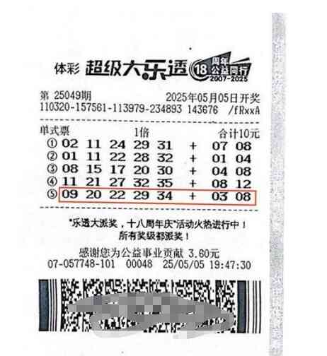 当晚,大乐透第25049期开奖,中奖号码为“09、20、22、29、34 + 03、08”。神奇的是,何女士购买的彩票上的第5注号码与开奖号码完全一致,她幸运地命中了当期一等奖,奖金高达9368629元。然而,有趣的是,何女士当时压根不知道自己中了大奖。第二天早晨,她去买菜时再次路过这家体彩网点,看到网点挂起了中奖横幅,还打趣道:“这个大乐透真可以中奖啊。”此时,她依然没有意识到幸运女神已经降临到自己身上。直到回到家中,她拿出彩票仔细核对,才惊喜地发现自己中了奖。