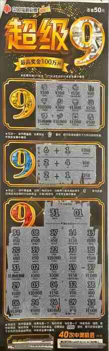 “超级9”刮刮乐游戏,每张售价50元,有三种玩法,最高奖金为100万元。