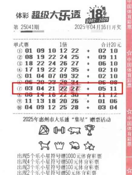 4月16日,超级大乐透第25041期迎来开奖时刻。前区开出的幸运号码为03、04、21、22、27,后区则摇出05、11。在这场充满惊喜的开奖中,惠州市惠东县稔山镇碧桂园海头埔苑12号楼3单元01号铺的4411032606体彩实体店传来喜讯,一位购彩者凭借一张彩票斩获一注大乐透一等奖,奖金总额高达928万元。