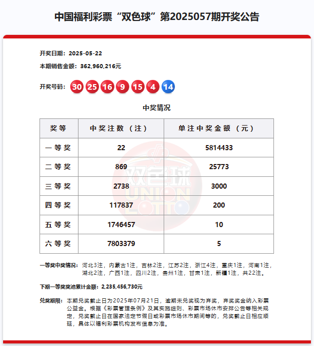 5月22日晚,中国福利彩票双色球游戏第2025057期开奖,本期双色球开奖号码为