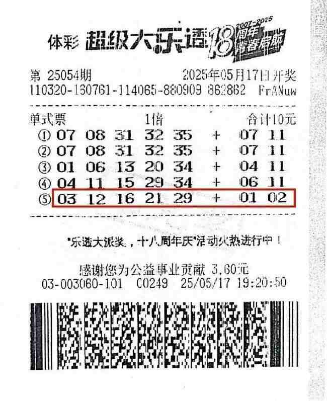 5月17日是大乐透第25054期的开奖日。晚饭后,王老伯突然想起当天还没买大乐透,便匆匆前往徐州3203003060体彩网点。到了网点,他先精心挑选了两注一模一样的大乐透自编号,随后又让销售员随机生成了三注号码。