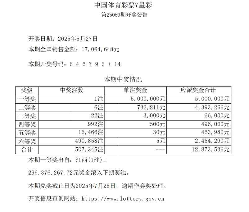 7星彩第25059期一等奖一注 奖池2.96亿元
