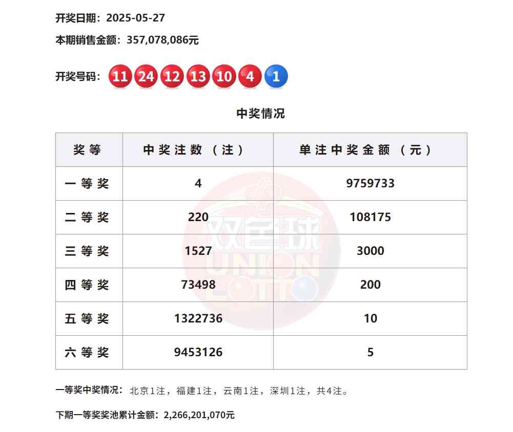 当期双色球一等奖中出4注。其中,北京1注、福建1注、云南1注、深圳1注,单注奖金975万元。