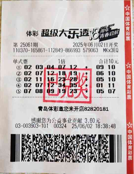 6月2日,超级大乐透第25061期如期开奖,前区摇出的号码为02、11、16、23、28,后区开出的号码是05、10。这一期开奖结果公布后,全国范围内共有10位幸运儿斩获一等奖。其中,山东青岛的一位购彩者成功中得1注基本投注一等奖,收获了高达813万余元的丰厚奖金。