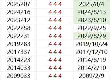 有趣的是,回顾福彩3D历史上10次开出“444”豹子号的时间,从2022年起,连续在8月份都出现了“444”豹子号。今年,“444”奖号同样在8月份现身,将这一神奇的规律延续到了第4年!
