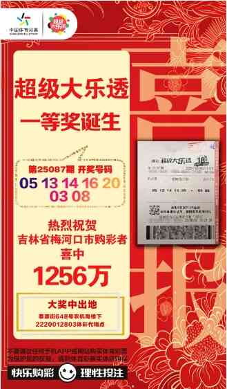 8月2日,超级大乐透第25087期开奖,前区号码为05、13、14、16、20,后区号码为03、08。其中,1注追加投注一等奖幸运降临梅河口市泰源街648号农机局楼下的2220012803体彩代销点。