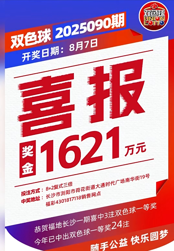 - 浏阳彩民中得1621万元大奖:一位来自浏阳的彩民采用“8+2复式3倍”投注方式,成功中得一等奖,合计奖金1621万元。该中奖彩票售出于荷花街道大通时代广场南华街19号的4301817118销售网点。