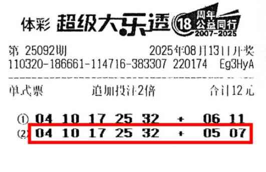 8月13日下午,李先生走进市开发区正大路的3208008243体彩网点。面对墙上密密麻麻的大乐透历史开奖号码,他没有过多纠结,全凭感觉选定了两注号码。这两注号码前区均为“04、10、17、25、32”,后区则稍有不同,分别是“06、11”和“05、07”。选好号码后,李先生见奖池颇高,便决定追加倍投2倍。