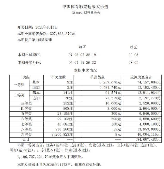 9月3日晚,体彩大乐透第25101期开奖,开奖号码为前区05 07 19 26 32,后区08 09。本期全国共中出9注一等奖,单注奖金823万余元,其中2注选择追加,额外获得659万元奖金,出自江苏和山东。其余7注基本一等奖分别来自江苏(2注)、安徽、山东、河南、广东和甘肃。二等奖方面,开出141注,单注奖金9.1万余元,其中30注采用追加投注,每注额外多得7.3万余元。