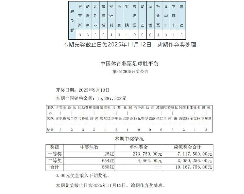 北京时间9月13日,足彩第25129期开奖结果揭晓。14场1等开出26注,单注奖金27.3万元,14场2等开出654注,单注奖金4664元。任九开出5542注,单注奖金2352元。本期足彩销量为15,887,322元,任九投注总额为20,372,214元。