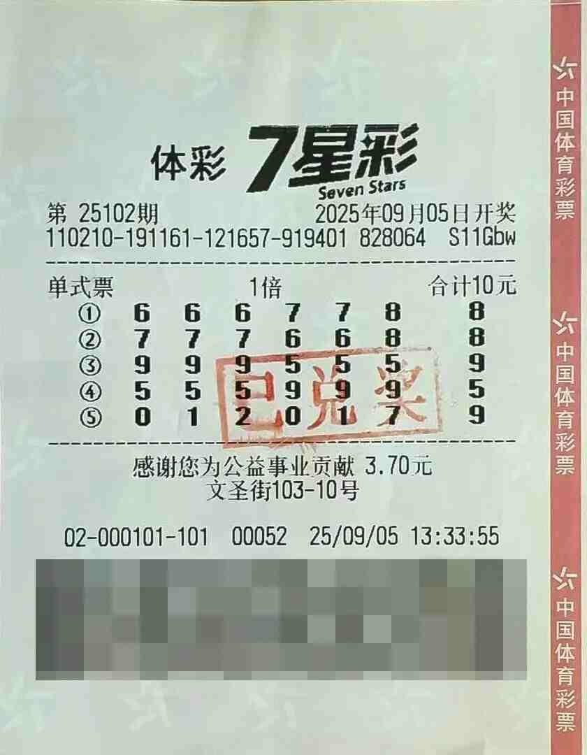 9月8日清晨,今年首注7星彩一等奖得主现身辽宁省体育彩票中心领奖。9月5日,体彩7星彩第25102期开奖,号码为7 7 7 6 6 8 + 8,全国共开出3注一等奖,单注奖金500万元,其中1注花落大连,这也是2025年辽宁购彩者中出的首注7星彩一等奖。
