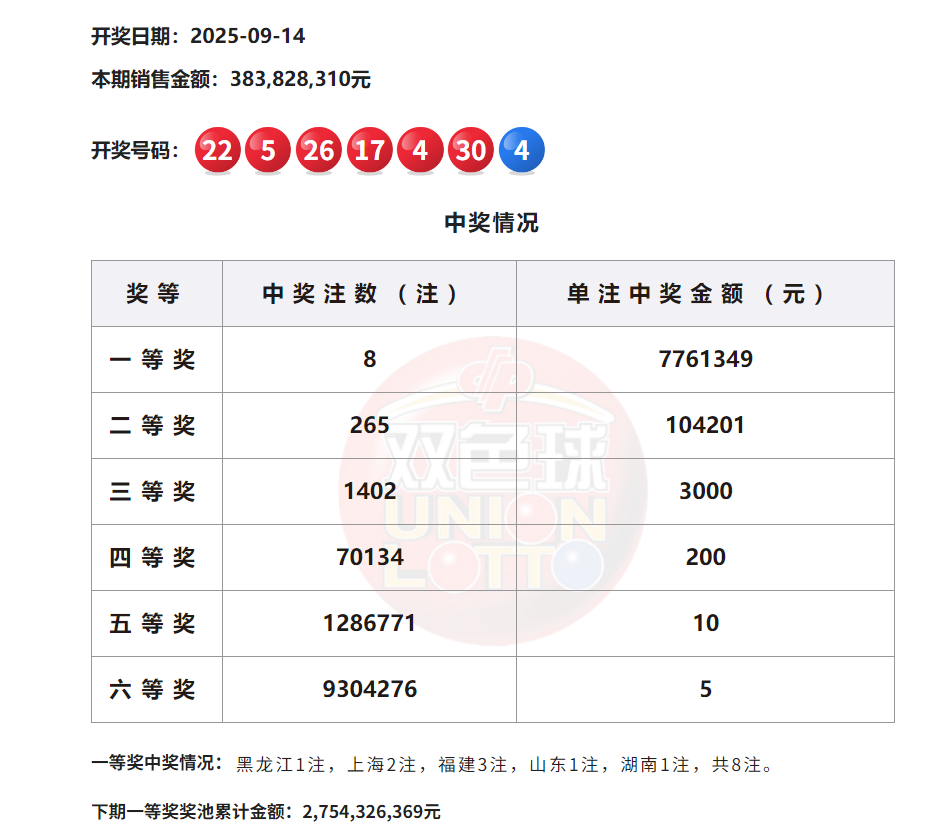 当期双色球一等奖中出8注,其中黑龙江1注、上海2注、福建3注、山东1注、湖南1注,单注奖金776万元。