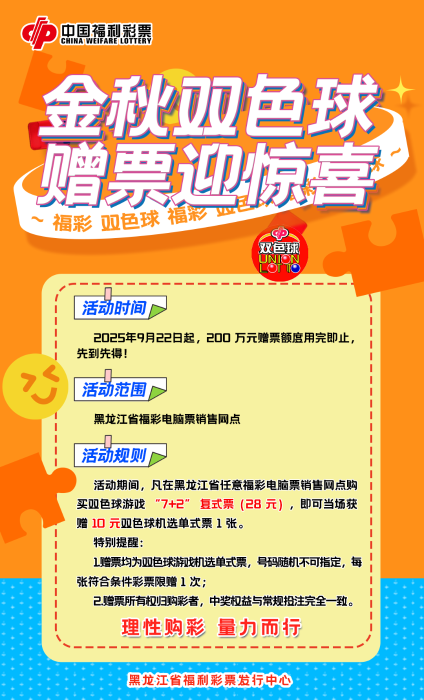 为回馈广大购彩者长期以来的支持与厚爱,龙江福彩将于2025年9月22日起,在全省推出“双色球游戏赠票营销活动”,为广大购彩者献上一份丰厚的金秋好礼,让惊喜加倍,为幸运助燃!