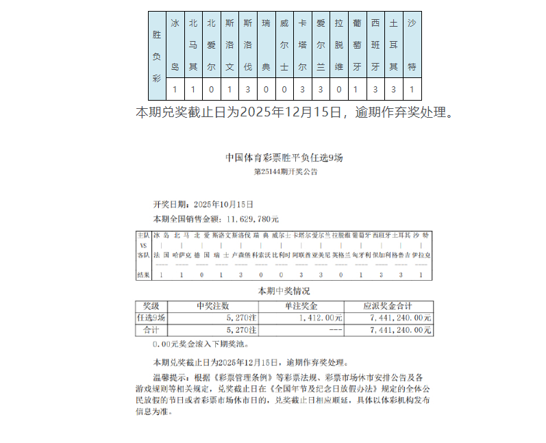 北京时间10月15日,胜负彩第25144期任九开奖结果揭晓。本期头奖开出5,270注,单注奖金1,412元,本期任九的投注总额为11,629,780元。