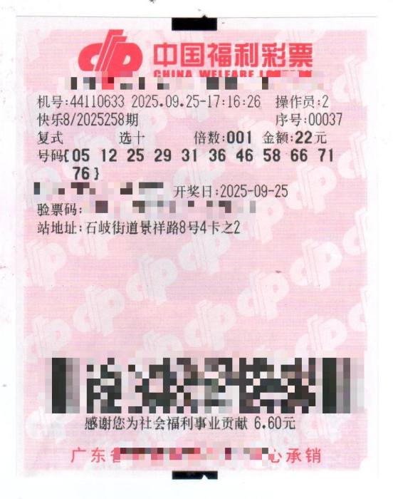 2025年9月25日,中国福利彩票“快乐8”第2025258期迎来开奖时刻。当期全国范围内,仅有1注“选十中十”大奖诞生,而这注承载着幸运的大奖,最终花落广东省中山市石岐街道景祥路8号4卡之2的44110633福彩销售站点。中奖彩票是一张投注金额为22元的选十玩法复式票,凭借这张彩票,幸运儿一举斩获1注“选十中十”、10注“选十中九”,累计中奖金额高达508万元。据统计,这已是中山市今年中出的第5个500万元以上的福彩大奖!