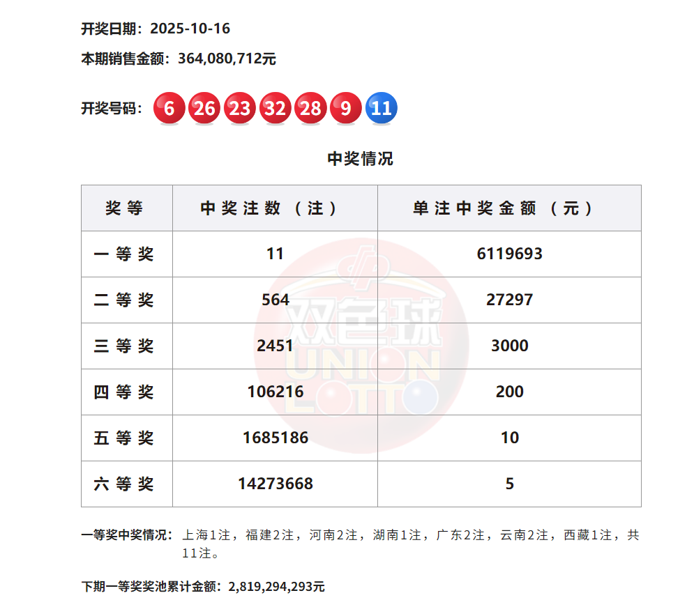 当期双色球一等奖中出11注,其中上海1注、福建2注、河南2注、湖南1注、广东2注、云南2注、西藏1注,单注奖金611万元。