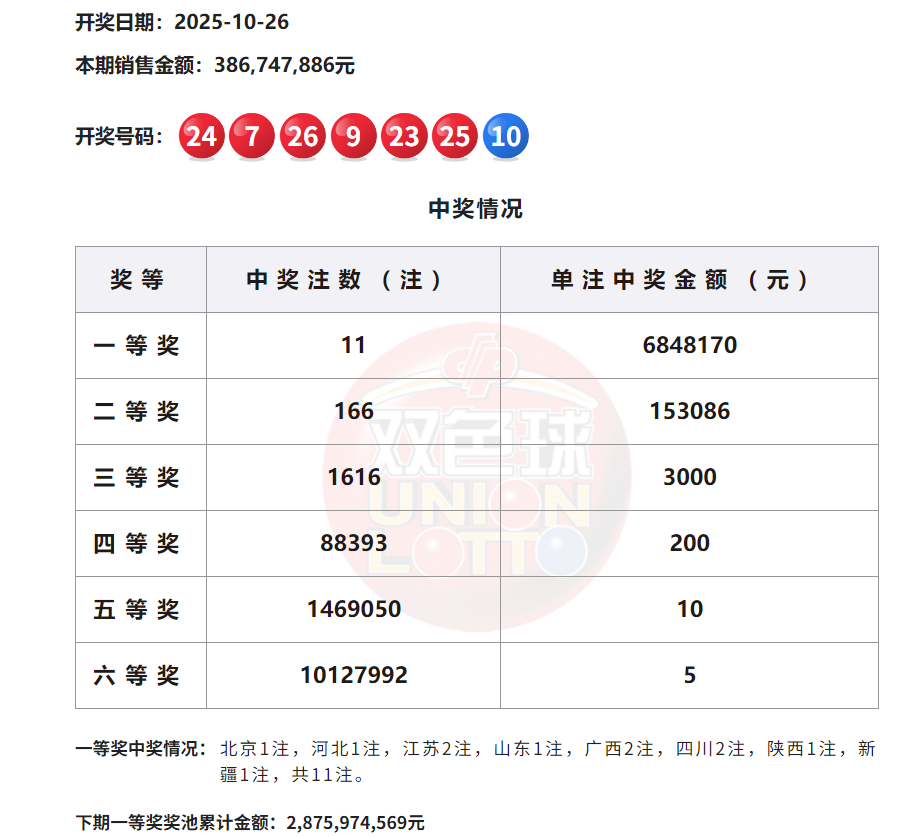 10月26日晚,中国福利彩票双色球游戏第2025123期开奖,本期双色球开奖号码为