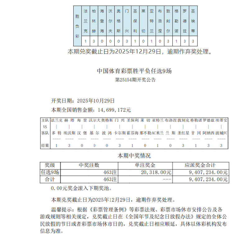 北京时间10月29日,胜负彩第25154期任九开奖结果揭晓。本期任九开出463注,单注奖金20,318元。本期任九投注总额为14,699,172元。