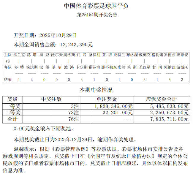 北京时间10月29日,胜负彩第25154期开奖结果揭晓。本期一等奖仅开出3注,单注奖金1,828,346元;二等奖开出73注32,201元;任九开463注20,318元。本期胜负彩销量为12,243,390元,任九投注总额为14,699,172元。