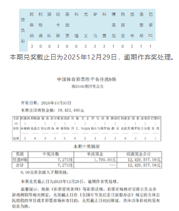 北京时间10月30日,胜负彩第25155期任九开奖结果揭晓。本期任九开出7,273注,单注奖金1,709元。本期任九投注总额为19,422,466元。