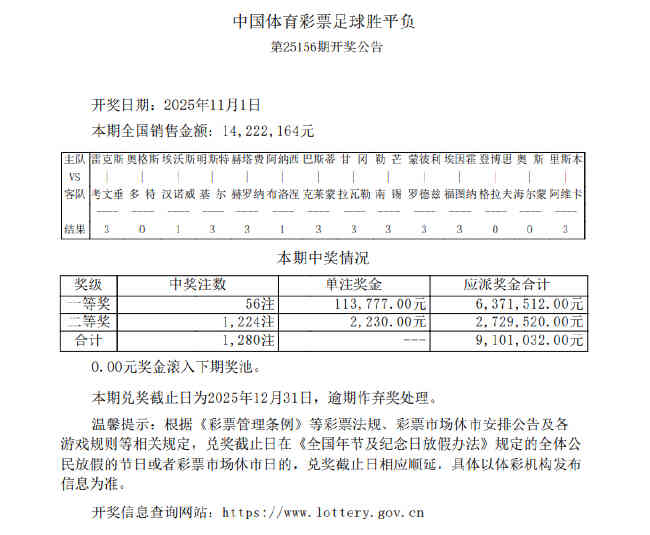 北京时间11月1日凌晨,胜负彩第25156期开奖结果揭晓。本期一等奖开出56注,单注奖金113,777元,二等奖共1,224注,单注奖金2,230元;任九开出11,228注973元。本期胜负彩销量为14,222,164元,任九投注总额为17,082,180元。