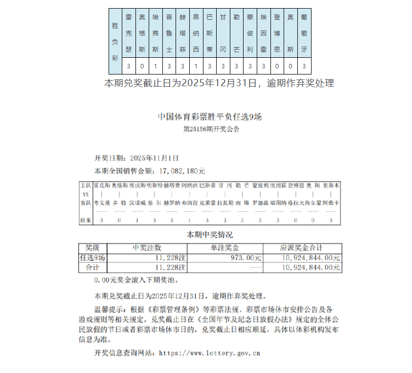 北京时间11月1日凌晨,胜负彩第25156期任九开奖结果揭晓。本期头奖开出11,228注,单注奖金973元,本期任九的销量为17,082,180元。