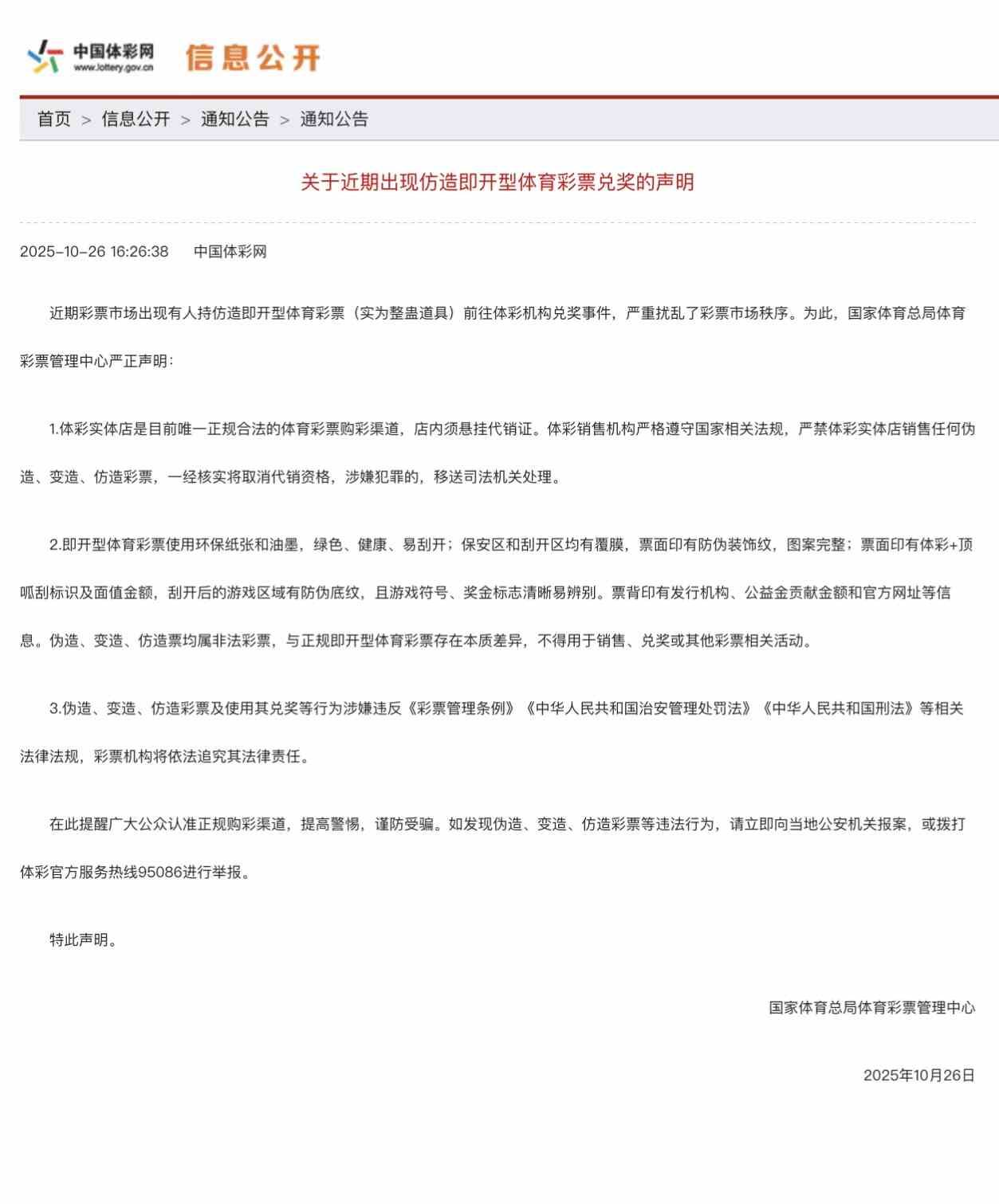 在此,国家体彩中心呼吁广大民众,一旦发现伪造、变造、仿造彩票等违法行为,立即向当地公安机关报案,或通过拨打体彩官方服务热线95086进行举报。