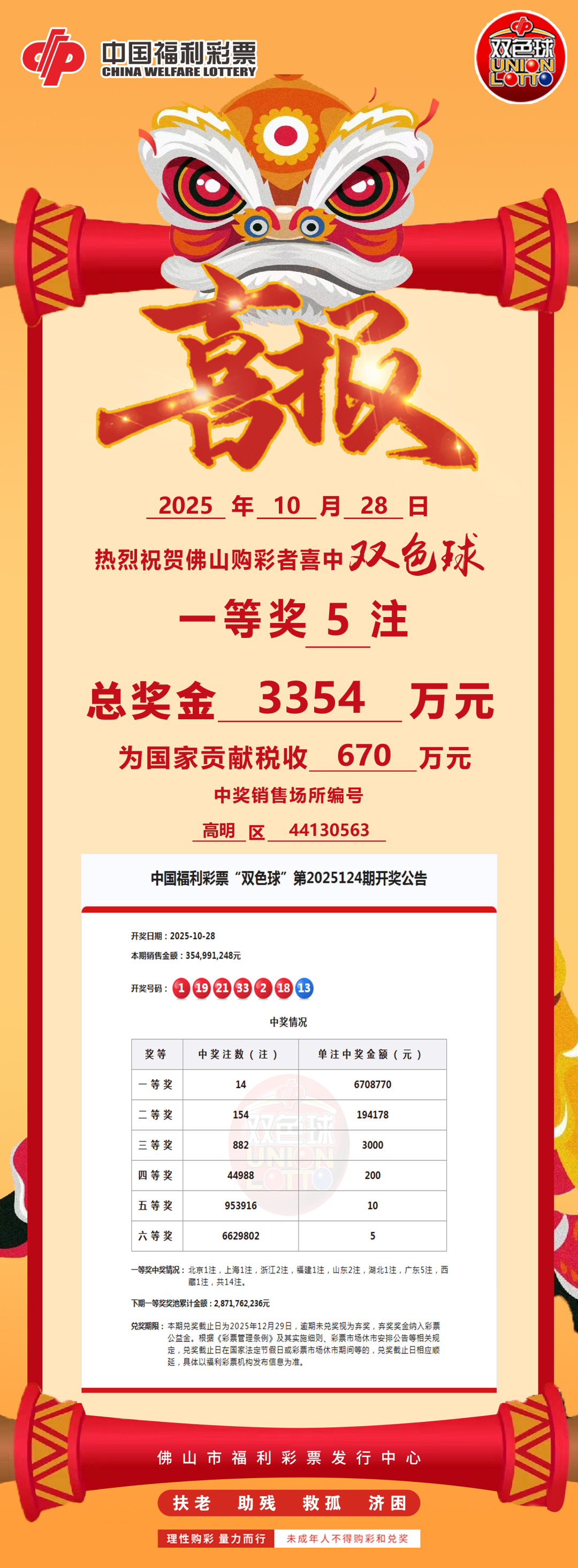 10月28日晚,中国福利彩票“双色球”第2025124期迎来开奖时刻。本期开奖,全国一等奖共计开出14注,单注奖金高达670.877万元。其中,高明区杨和镇的一位幸运彩民独揽5注一等奖,将总计3354万元的税前奖金收入囊中。