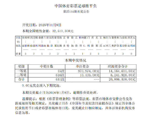 北京时间11月9日,胜负彩第25164期开奖结果揭晓。本期胜负彩一等奖开出15注,单注奖金970,974元;二等奖开出616注,单注奖金10,133元;任九场开出5872注,单注奖金2558元。本期14场销量为32,510,308元,任九投注总额为23,469,708元。