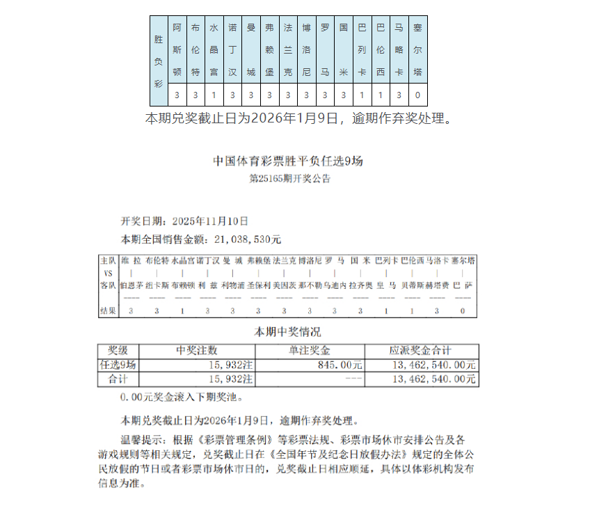 北京时间11月10日,胜负彩第25165期任九开奖结果揭晓。本期任九开出15932注,单注奖金845元。本期任九投注总额为21,038,530元。