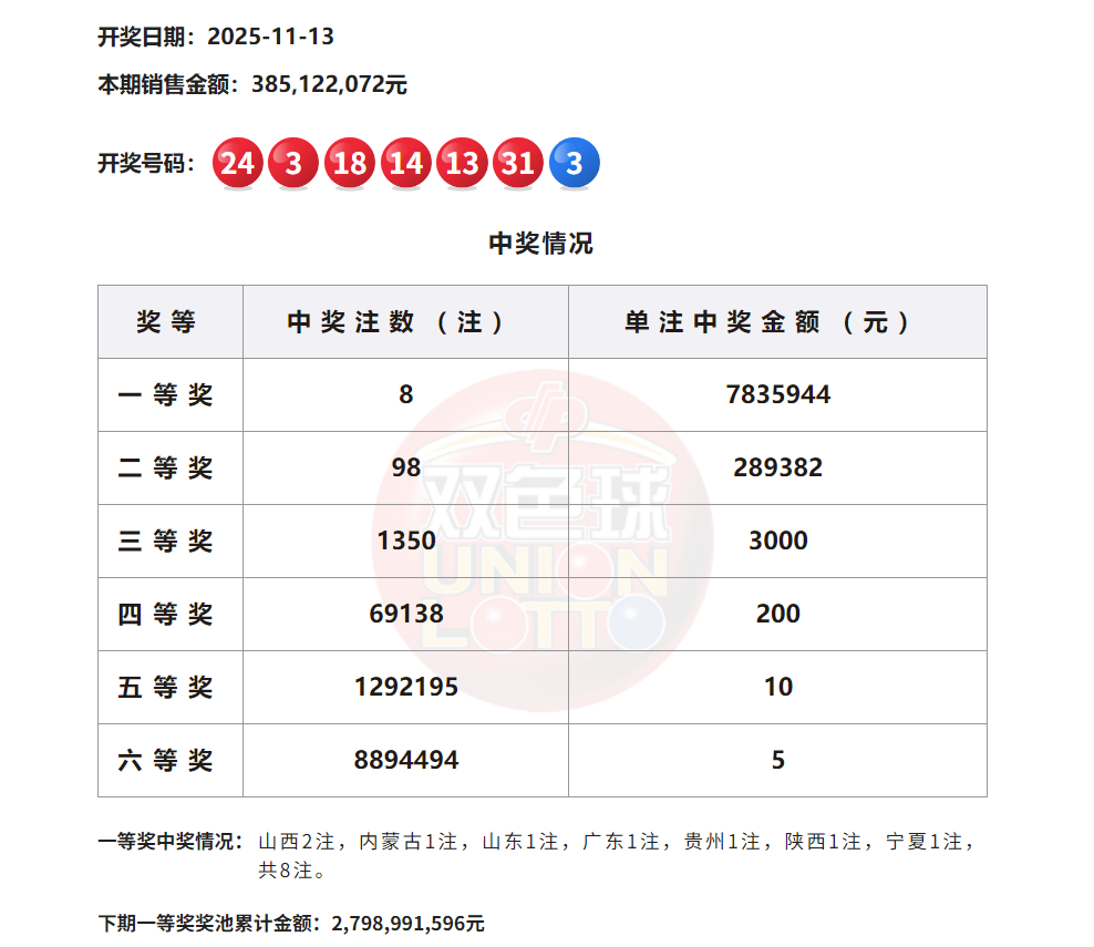 11月13日晚,中国福利彩票双色球游戏第2025131期开奖,本期双色球开奖号码为