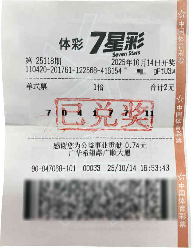 10月14日,7星彩第25118期迎来开奖时刻,当期开奖号码为“7 0 4 1 7 7 + 11”。全国范围内,共有2位幸运儿斩获一等奖,单注奖金高达500万元,这2注一等奖分别花落浙江与湖北。其中,湖北潜江47068体彩销售点成为幸运之地,购彩者尤先生(化姓)凭借一张彩票喜中500万元大奖。
