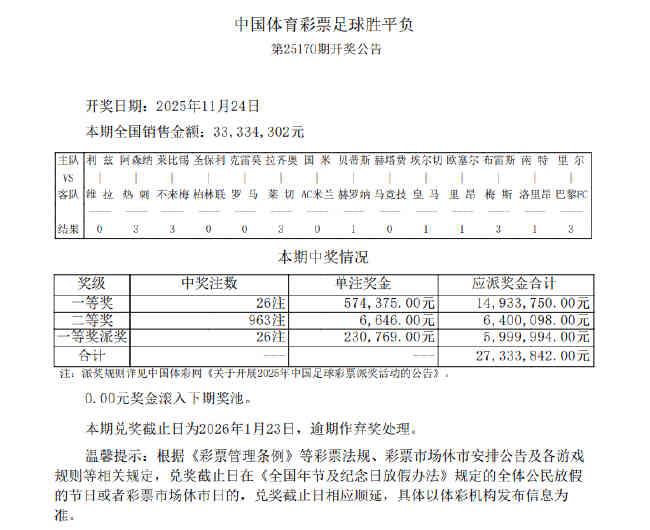 北京时间11月24日,足彩第25170期开奖结果揭晓。本期足彩头奖开出26注,单注奖金574,375元,本期600万派奖奖金全部派完,每注多得230,769元,单注共计805,144元;二等奖开出963注6,646元。任九开出6204注2755元,因派奖每注可多得967元,单注共计3722元。本期14场销量为33,334,302元,任九投注总额为26,711,580元。