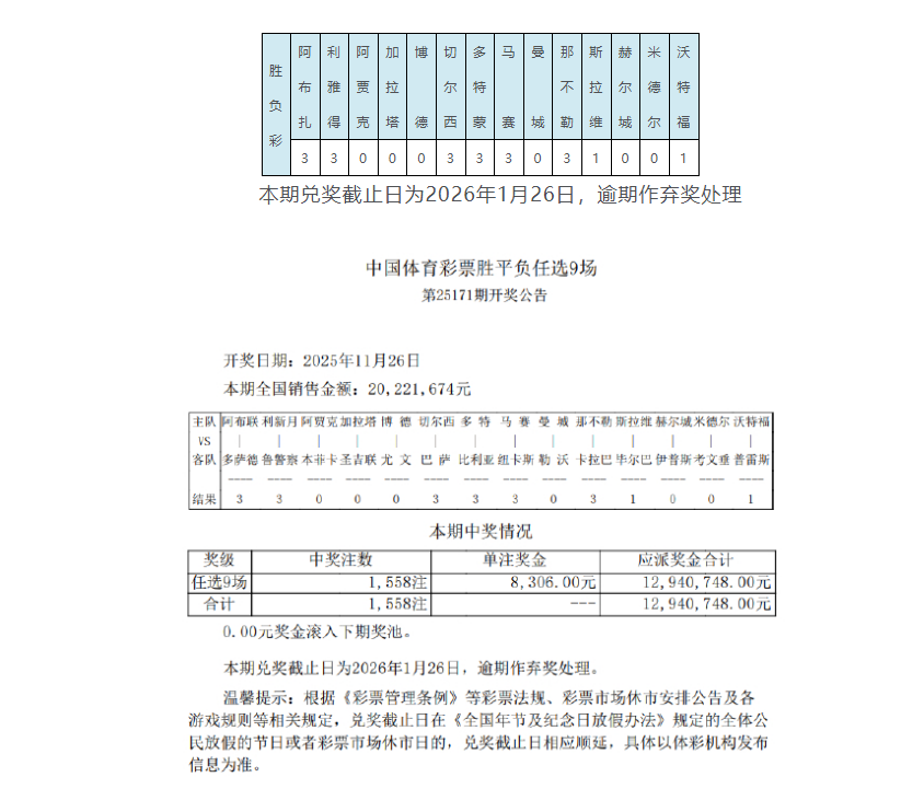 北京时间11月26日,胜负彩第25171期任九开奖结果揭晓。本期任九开出1558注,单注奖金8306元。本期任九的投注总额为20,221,674元。