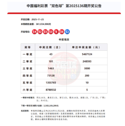 22:07 本期一等奖开出43注,单注奖金546万元,43注头奖分落7地,其中河北中出20注,若为一人所中,该彩民将揽1.09亿巨奖;此外重庆中出18注,若为一人所中,则将揽9840万巨奖;黑龙江、浙江、湖南、广东和广西各1注;二等奖开出101注,单注奖金24.8万余元。本期双色球全国销量为3.61亿余元,计奖结束后奖池余额为25.83亿余元。