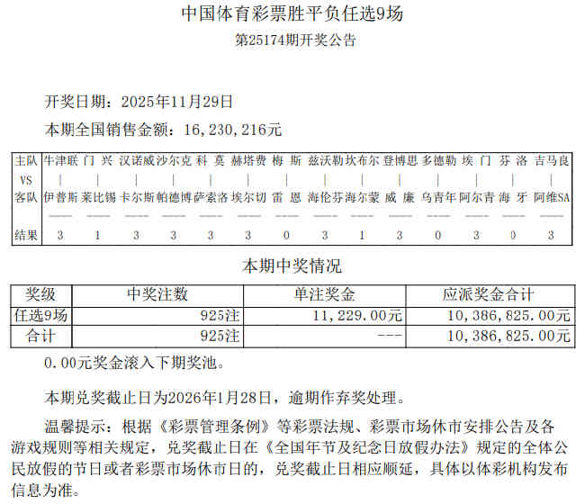 北京时间11月29日,胜负彩第25174期任九开奖结果揭晓。本期任九开出925注,单注奖金11229元。本期任九投注总额为16,230,216元。
