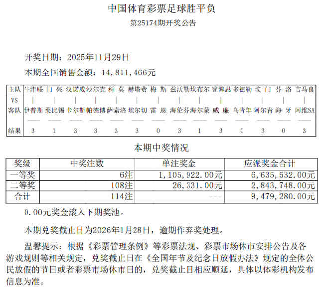 北京时间11月29日,胜负彩第25174期开奖结果揭晓。本期足彩头奖仅开出6注,单注奖金1,105,922元;二等奖开出108注26331元;任九开925注11229元。本期胜负彩销量为14,811,466元,任九投注总额为16,230,216元。