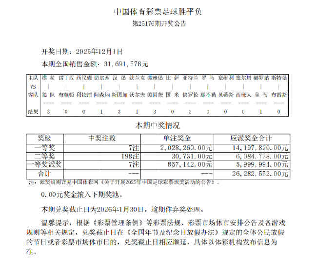 北京时间12月1日,胜负彩第25176期开奖结果揭晓。足彩派奖头奖开出7注,单注奖金2,028,260元,本期600万派奖奖金全部派完,每注多得857,142元,单注共计2,885,402元。二等奖开出198注30,731元。任九开出1,283注13,354元,因派奖每注可多得4,676元,单注共计18,030元。本期14场销量为31,691,578元,任九投注总额为26,771,682元。