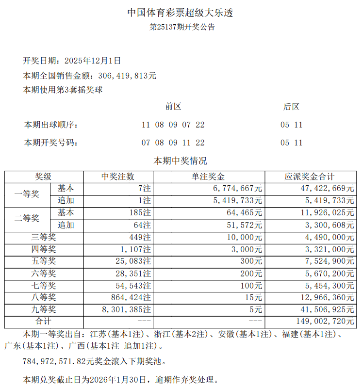 12月1日,超级大乐透第25137期开奖。前区开出号码07、08、09、11、22 ;后区开出号码05、11。本期全国销售3.06亿元,为国家筹集彩票公益金1.1亿元。