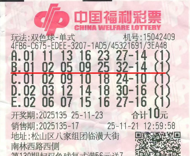 福彩双色球第2025135期开奖,红球开出01、02、05、09、25、32,蓝球为10。赤峰彩民陈先生(化名)凭借一张机选五注的彩票,成功斩获二等奖一注、五等奖一注,奖金共计236554元。