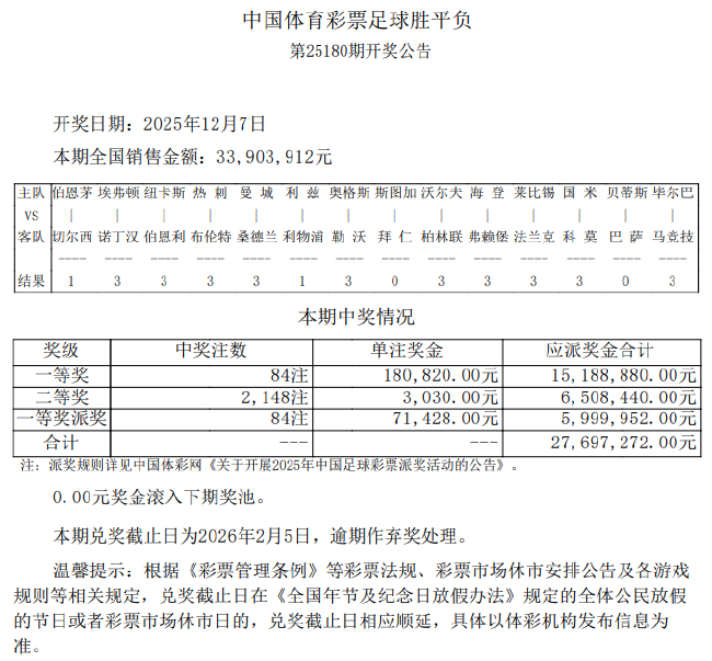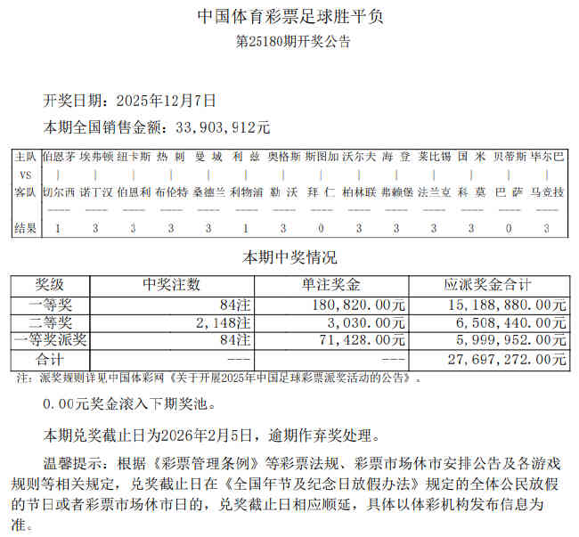 北京时间12月7日,足彩第25180期开奖结果揭晓。本期足彩派奖头奖共开出84注,单注奖金180,820元,本期600万派奖奖金全部派完,每注多得71,428元,单注共计252,248元。二等奖开出2148注3030元。任九开出15,973注1111元,因派奖每注可多得375元,单注共计1486元。本期胜负彩销量为33,903,912元,任九投注总额为27,740,486元。