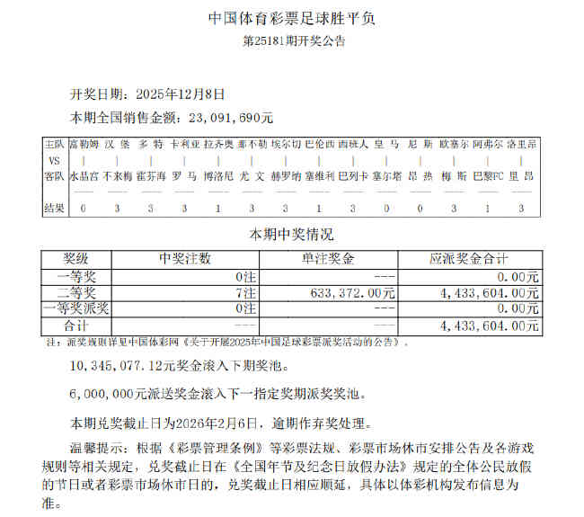北京时间12月8日,足彩第25181期开奖结果揭晓。本期足彩头奖空开,600万派奖奖金将顺延至下期足彩派奖,即本周六(12月13日)停售的足彩,当期足彩派奖金额为1200万。另外,因头奖空开,1034万余元滚存至第25182期(12月9日)竞猜。二等奖开出7注,单注奖金高达63.3万元,二等奖金排今年第5高。