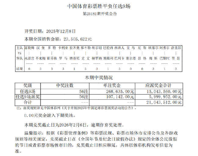 北京时间12月8日,足彩第25181期任九开奖结果揭晓。任九开出56注268,635元,因派奖每注可多得107,142元,单注共计375,777元。值得一提的是,本期任九奖金创今年最高纪录!本期任九投注总额为23,505,622元。