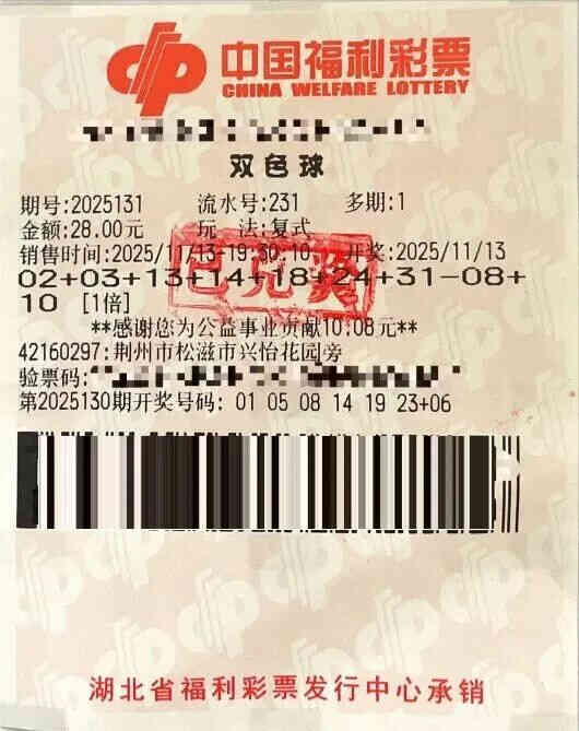 11月13日晚,福彩双色球第2025131期开奖,我省中出3注单注28.9万元的二等奖。其中,松滋市购彩者戴先生(化名)凭借一张7+2小复式票,一举斩获两注二等奖,总奖金达58万余元。