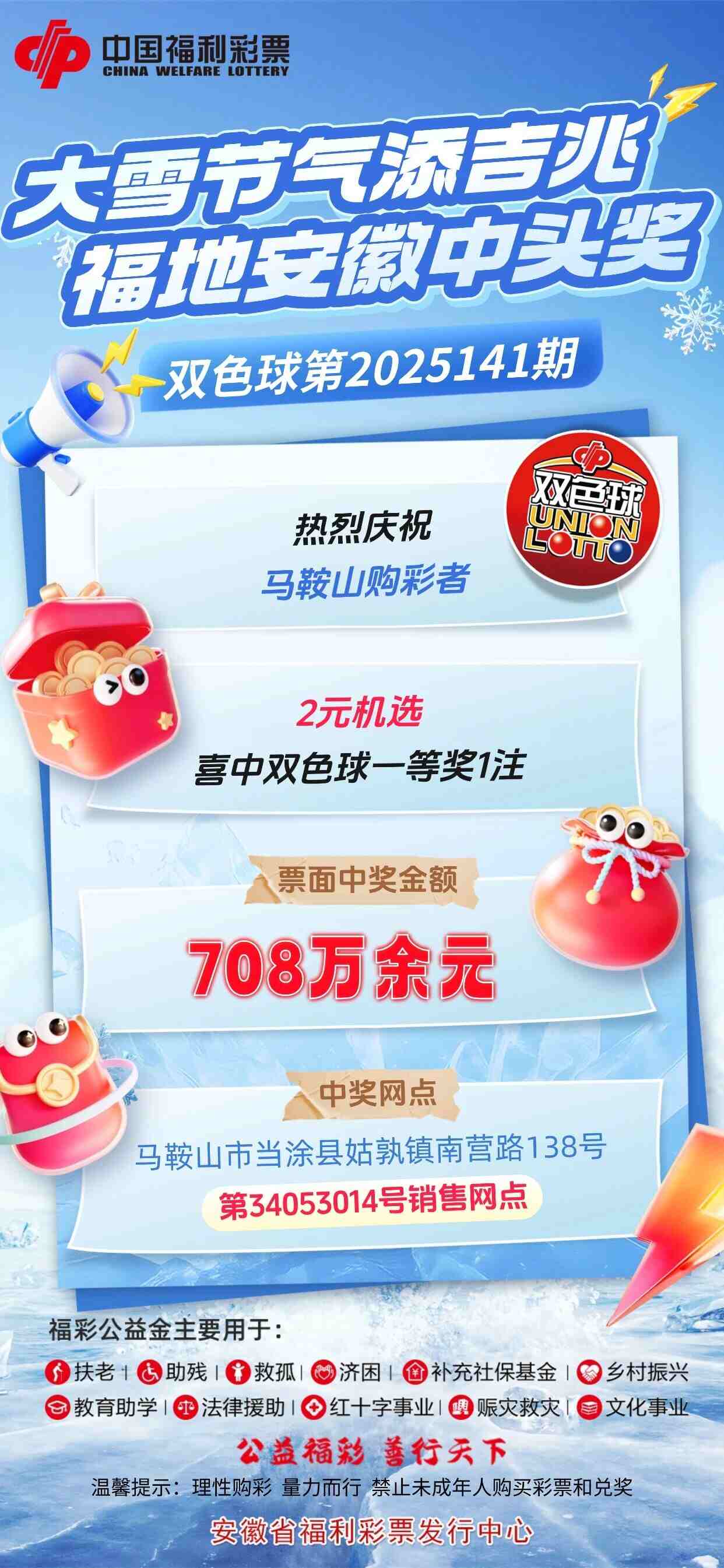大雪节气好运至!马鞍山购彩者喜中双色球708万大奖