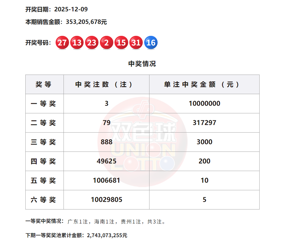 当期双色球一等奖中出3注,分落广东1注、海南1注、贵州1注,单注奖金1000万元。