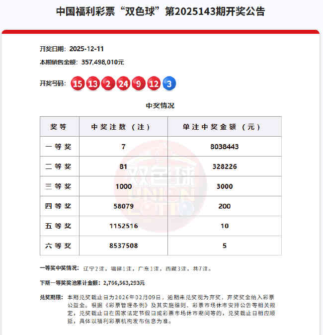12月11日晚.,中国福利彩票双色球游戏第2025143期开奖,本期双色球开奖号码为