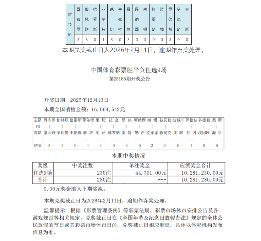 北京时间12月13日,足彩第25185期任九开奖结果揭晓。本期任九开出230注,单注奖金44,701元。本期任九投注总额为16,064,542元。