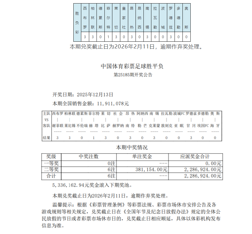 北京时间12月13日,足彩第25185期开奖结果揭晓。本期足彩头奖空开,533万滚存至第25186期足彩竞猜;二等奖开出6注,单注奖金381,154元;任九开出230注,单注奖金44,701元。本期胜负彩销量为11,911,078元,任九投注总额为16,064,542元。