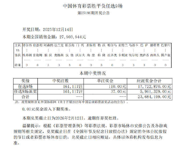 北京时间12月14日,足彩第25186期任九开奖结果揭晓。本期任九开出161,117注110元,因派奖每注可多得37元,单注共计147元。本期任九投注总额为27,903,944元。